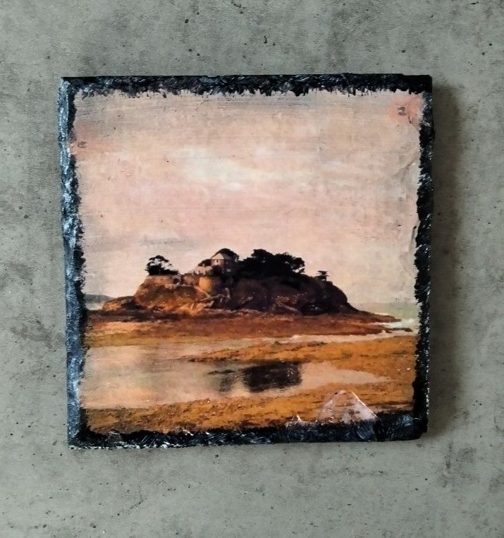 Dessous de verre en ardoises rustiques et naturelles de 10 cm par 10 cm. Photos peinture vernie. Résistant à l’eau mais ne résiste pas aux contacts de forte chaleur.
