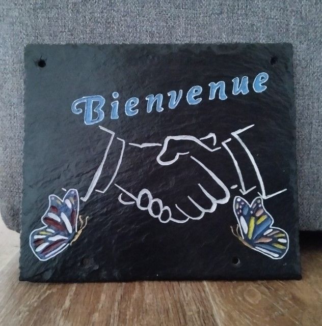 Gravée à la main. Peut-être installé en extérieur comme en intérieur. Vernie protection UV et résistant à l'eau. 22 cm par 19 cm