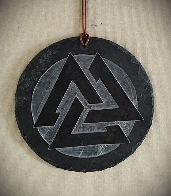 Suspension murale Valknut (3) en ardoises rustiques et naturelles de 17.3 cm de diamètre . Gravé à la main. 100% fait main.